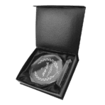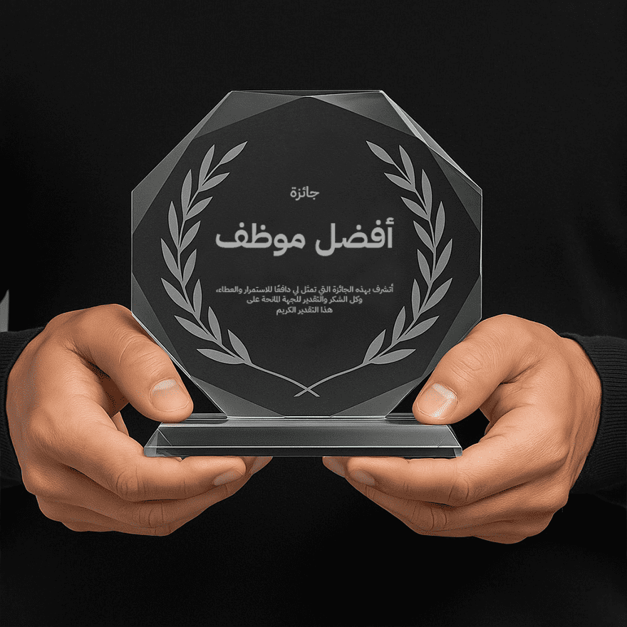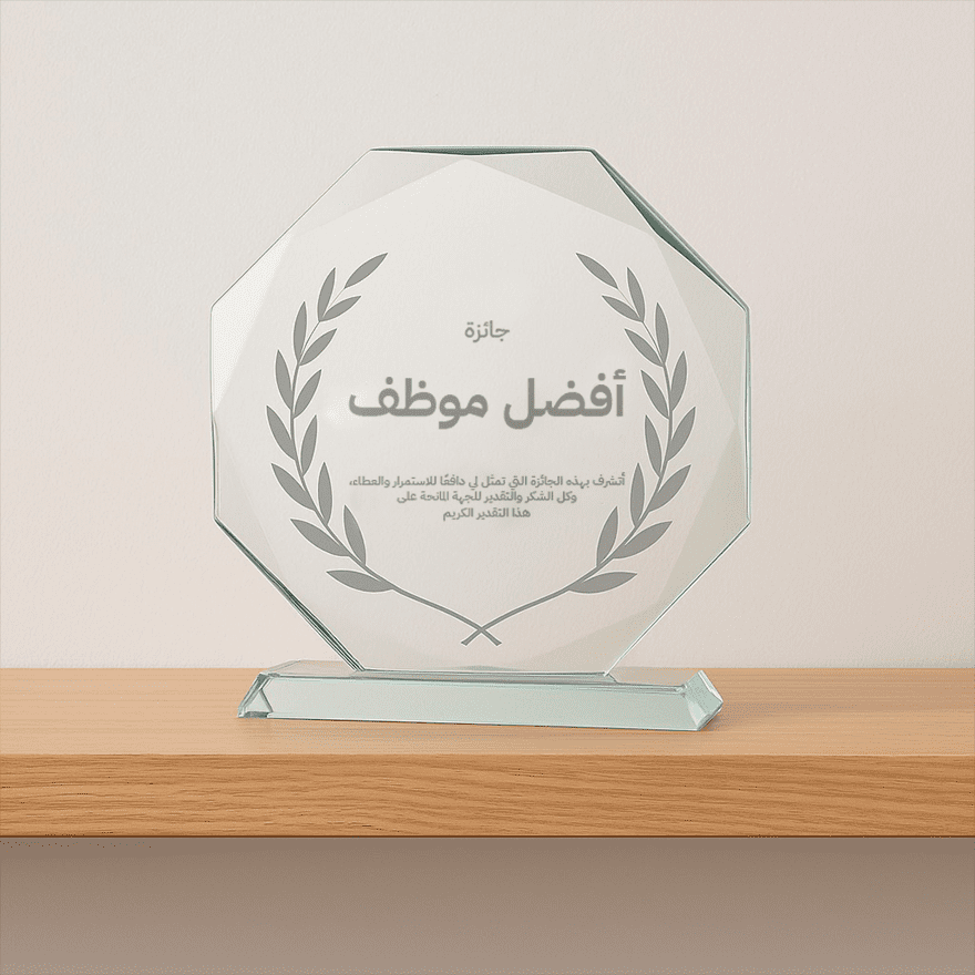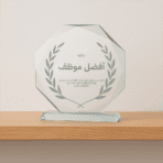 يأتي الدرع مغلفًا داخل علبة كرتونية أنيقة للحفاظ عليه أثناء النقل والتقديم. متوفر بثلاثة أحجام مختلفة ليتناسب مع مختلف المناسبات والميزانيات.
