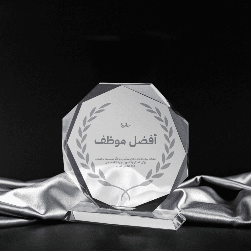 درع كريستالي دائري يتميز بمظهر أنيق وفاخر بفضل تقنية القص بالليزر التي تمنحه حوافًا ناعمة وتصميمًا دقيقًا. مثالي للتكريم والجوائز التقديرية في المناسبات الرسمية أو الفعاليات الخاصة.
